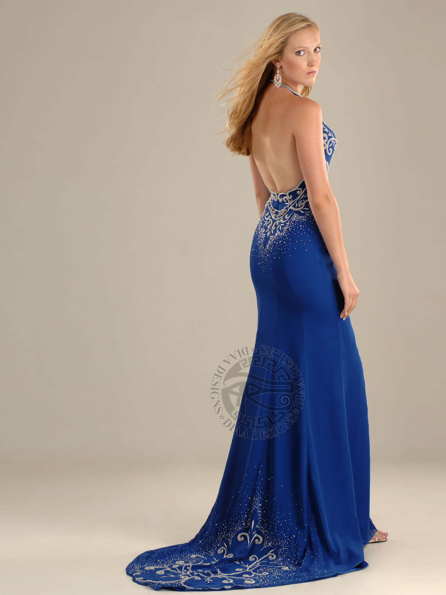 This beautiful and elegant dress featured a V-shaped halter with embellishments of embroidery, stones, and raised beading on upper front, back and train. This dress also has an embellished side front slit and a center back zipper.