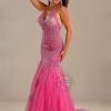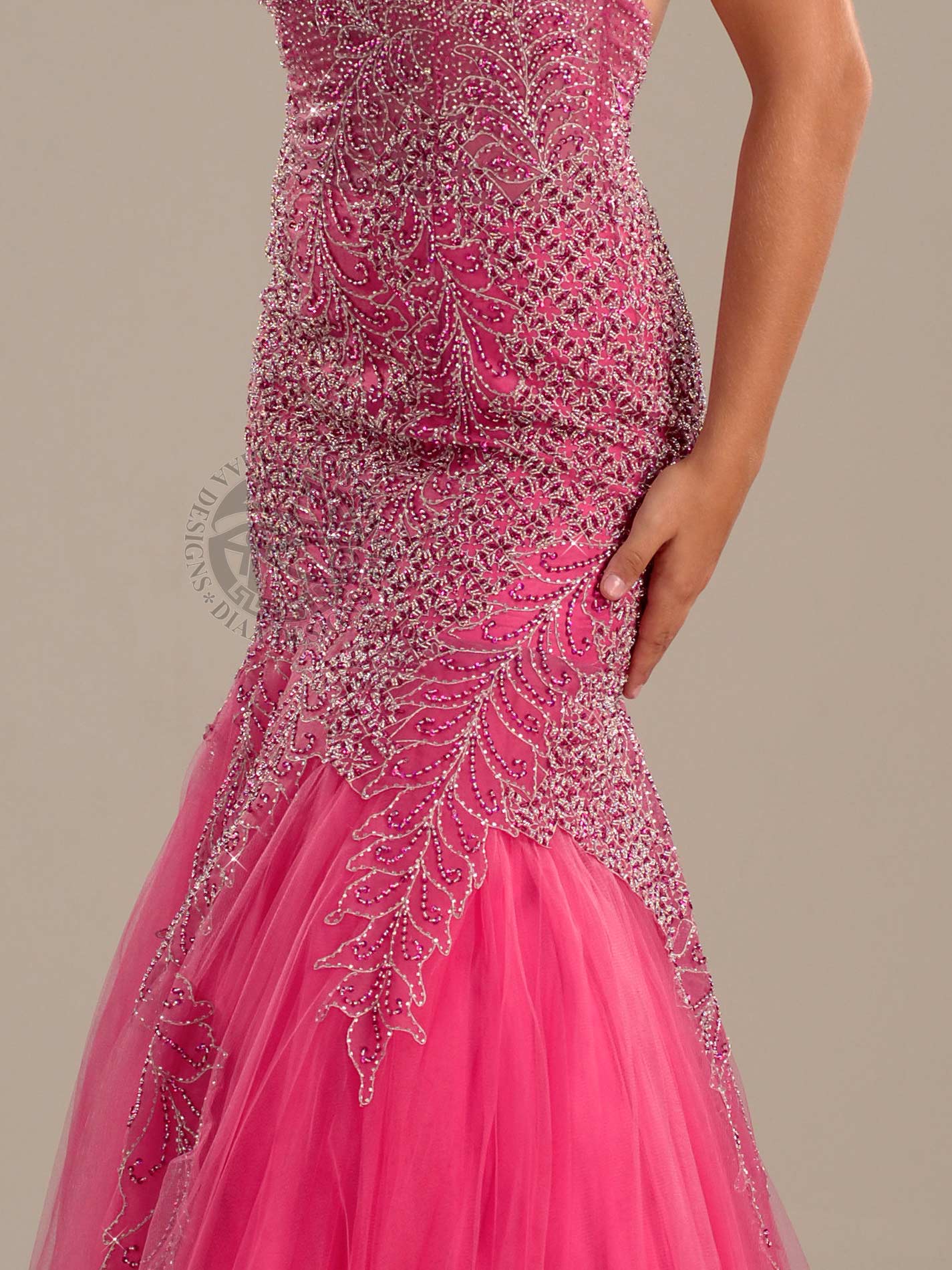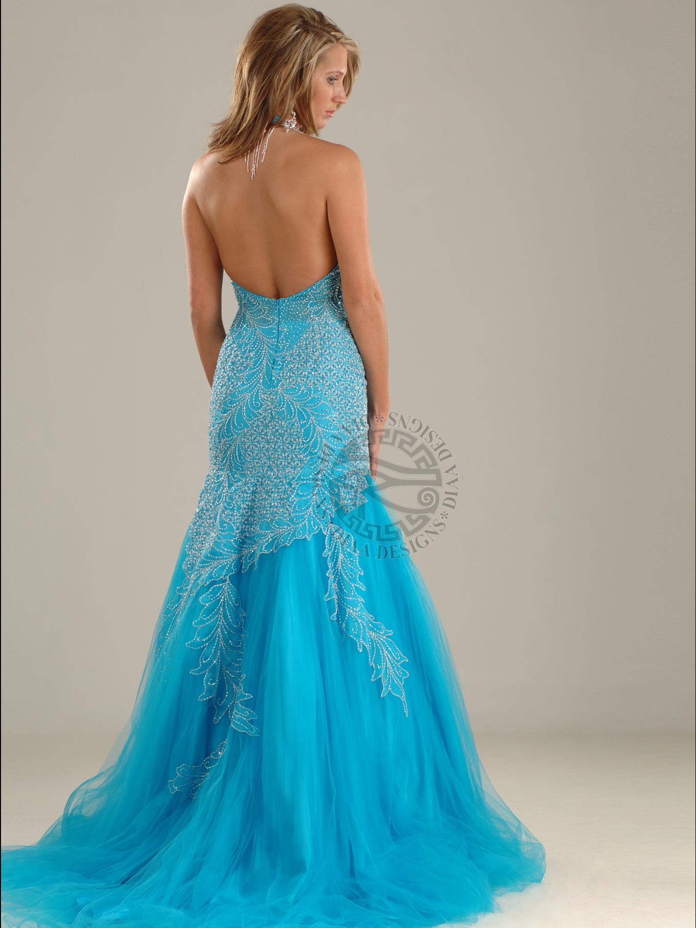 Stun everyone in this Red Carpet halter mermaid gown that has very heavy beads and stones on bust area and is embellished with embroidery and bead work all over upper front and back above knee. This dress has back neck dangling beads, a low back, center zipper and the mermaid skirt has many layers of Net that leads in the back to a long train. Drop dead gorgeous gown!