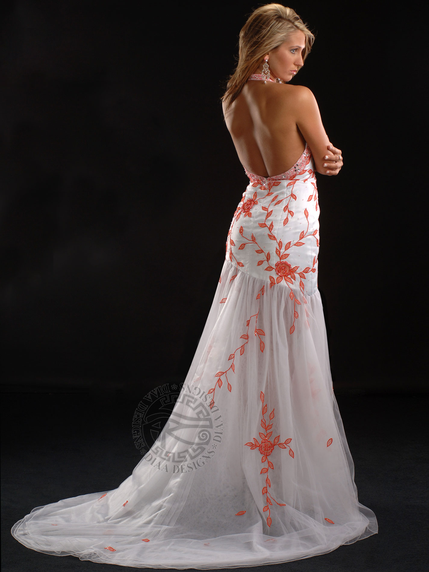 Elegant and sexy Net dress with embellished halter V-neckline. It has a front side slit and an elegant open back with see-through flowy skirt. This dress also features an embellished with flower applique throughout the front and back of dress and train and a center back zipper.