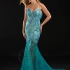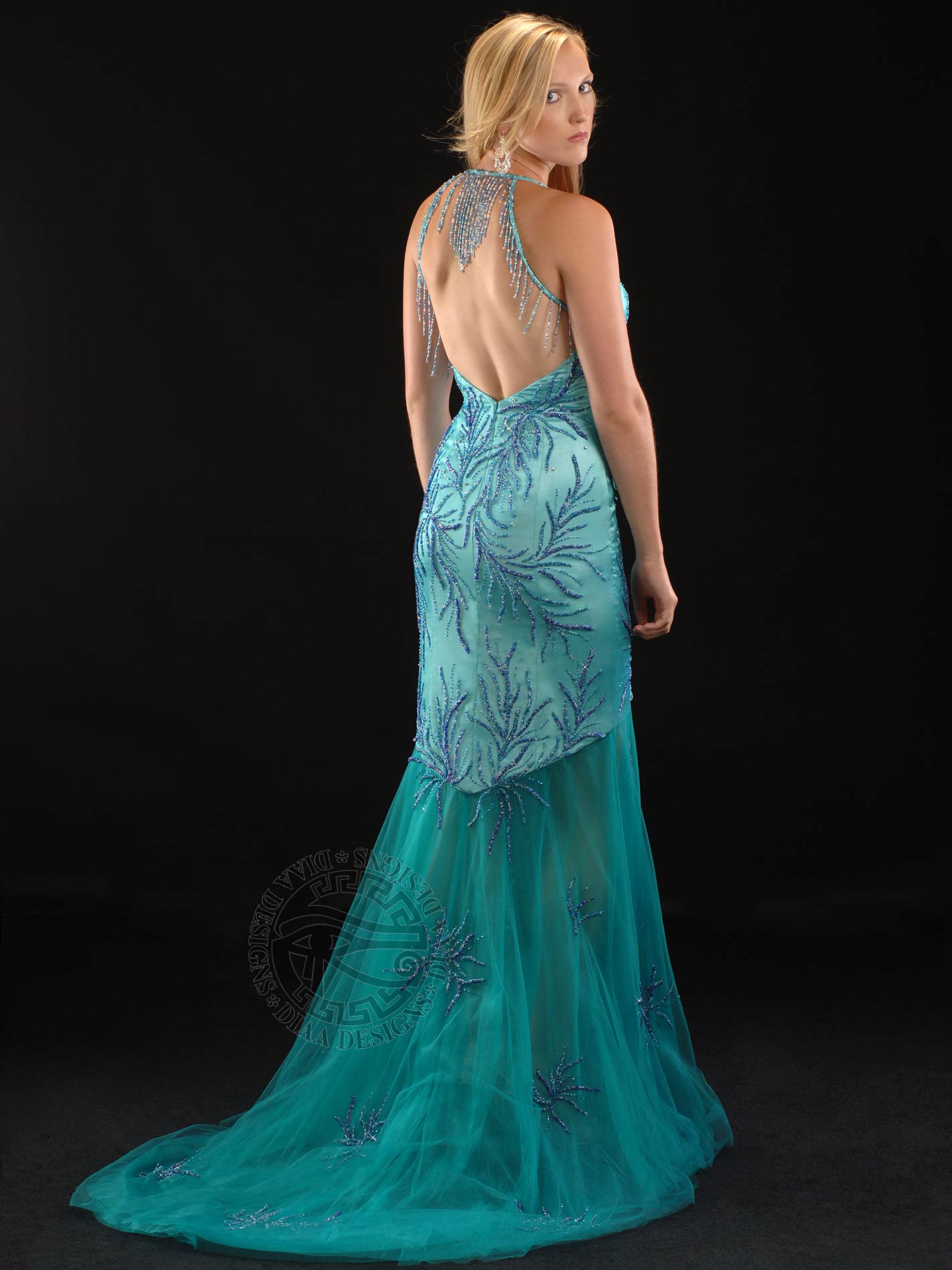 This net over Satin dress has sweetheart neckline and thin spaghetti straps with low V neckline back and beaded straps with dangling hanging back beads. It also has see-through flared above the knee skirt featuring beautiful raised multi-colored beading design throughout the dress and train.