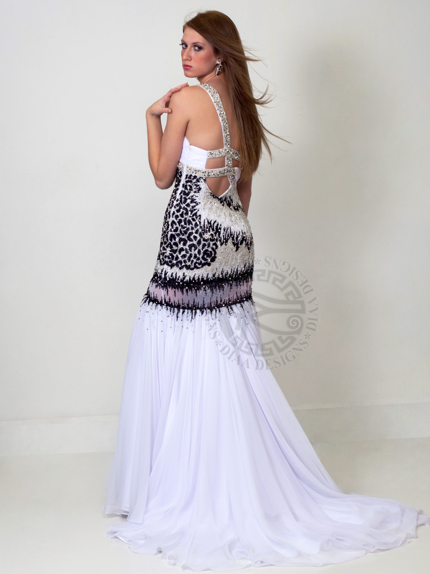 This gown is gracefully elegant and very Couture. It has animal print bead-work and rhinestones details, some Chiffon pleating, a sweetheart neckline, a one shoulder strap and high slit on front dress along with see-through mesh connecting to a whisper flowy chiffon skirt leading to a train. It also has a semi-low sexy back that has beaded rhinestones straps and a side zipper.