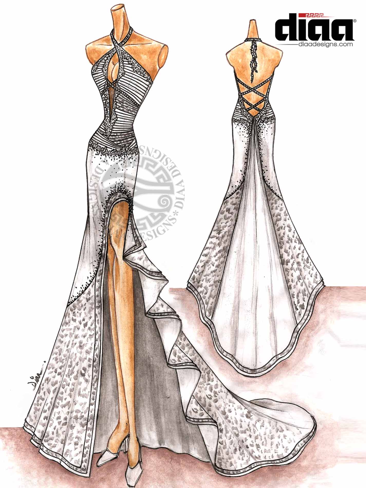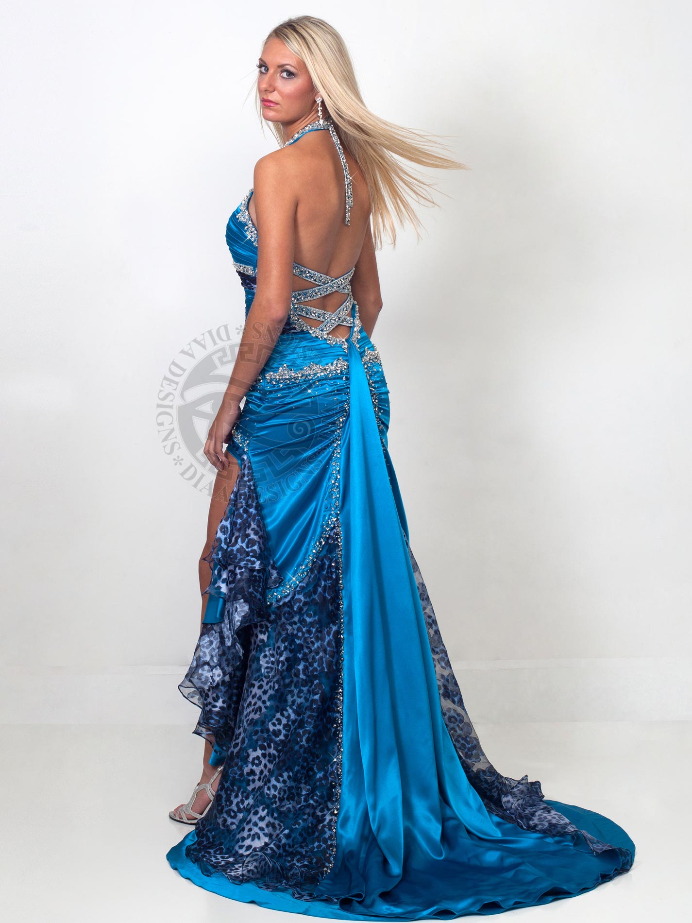 Rhine-stoned couture cut keyhole halter criss-cross dress with pleated beautiful animal print Organza and Satin upper dress, full of sparkling rhinestones and scattered beads on front while the back of the dress is a low back with sexy criss-cross straps and heavy rhinestones, beaded with elegance. This elegant dress has a rounded slit with Organza layers, flowy back with a long train and a side zipper.