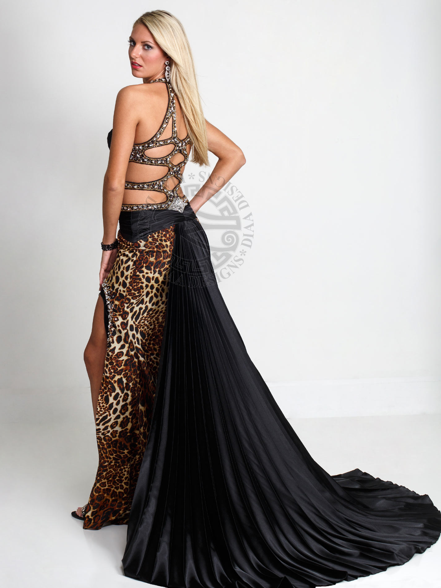 This is a bold and sexy dress featuring heavy center upper front shaped rhinestones, a heavy beaded halter straps that connect to high cut-out beaded with scattered rhinestones back details. This drop dead gorgeous dress has a pleated bust and hip areas along with a pleated satin train overlay, a high rounded slit, center back zipper and a long print train.