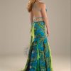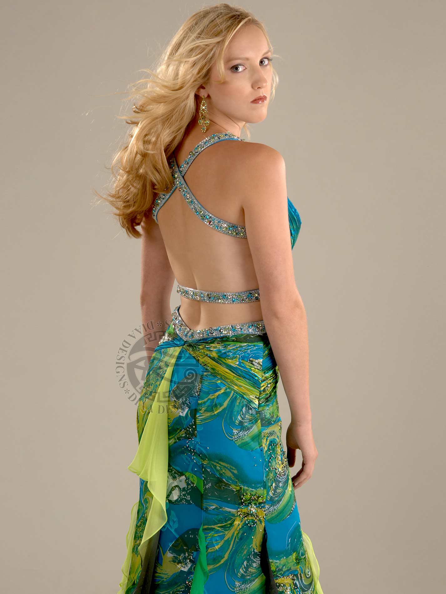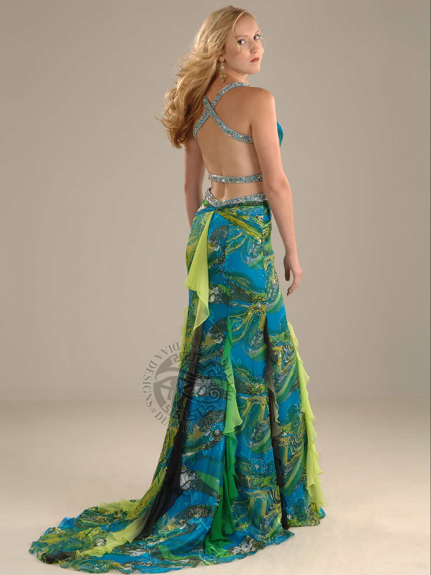 Stunning and sexy Print dress with plunged neckline and open waist with belt. This dress has inserted Ombre matching Chiffon seam ruffles with see-through illusioned front slit and scattered beads and sequins throughout dress. The straps and belt are fully beaded with scattered rhinestones. It also has an open sexy back with beaded criss-cross straps, a side zipper and a train. Such a beautiful print that attracts all eyes when entering the room!
