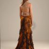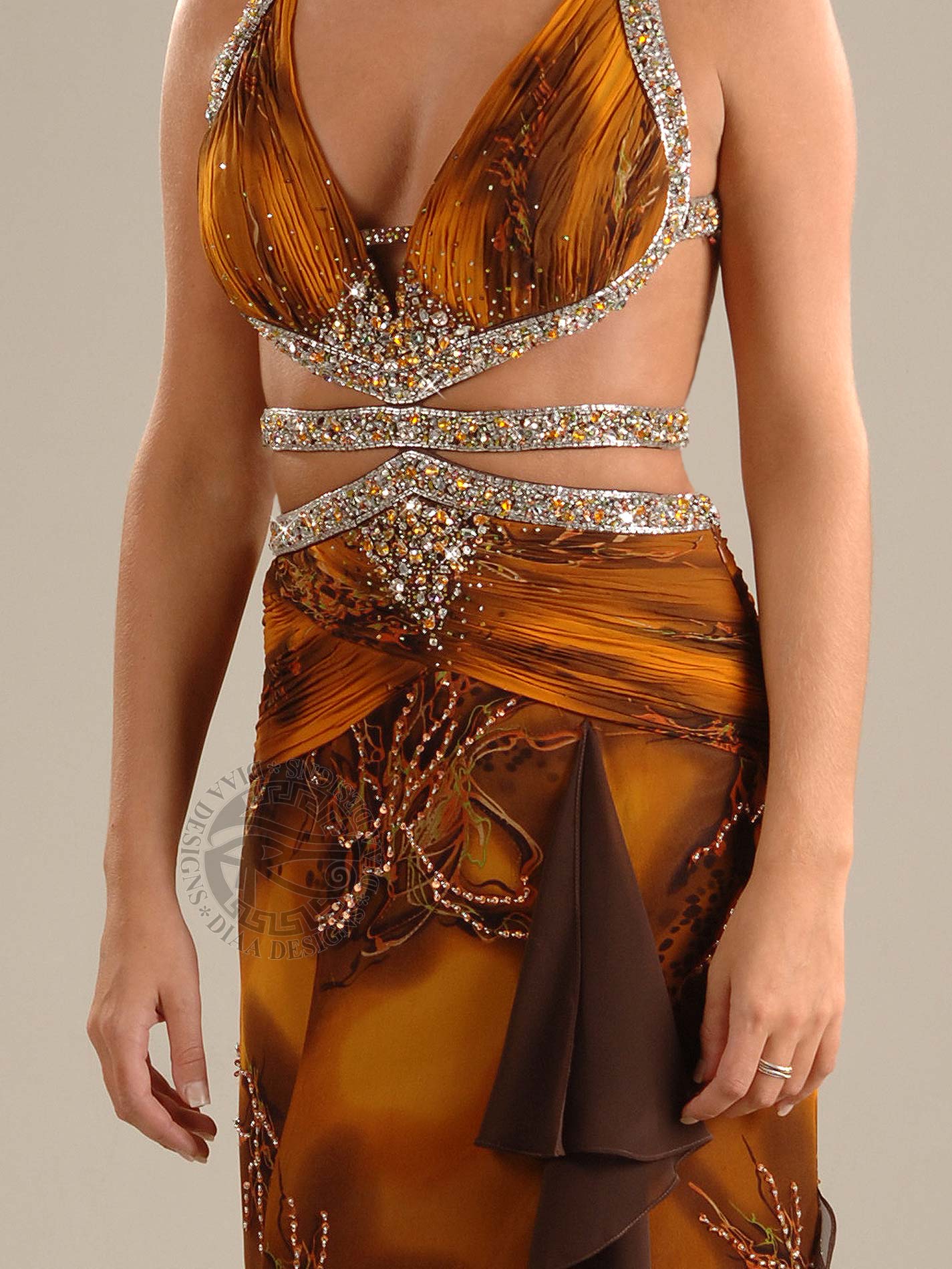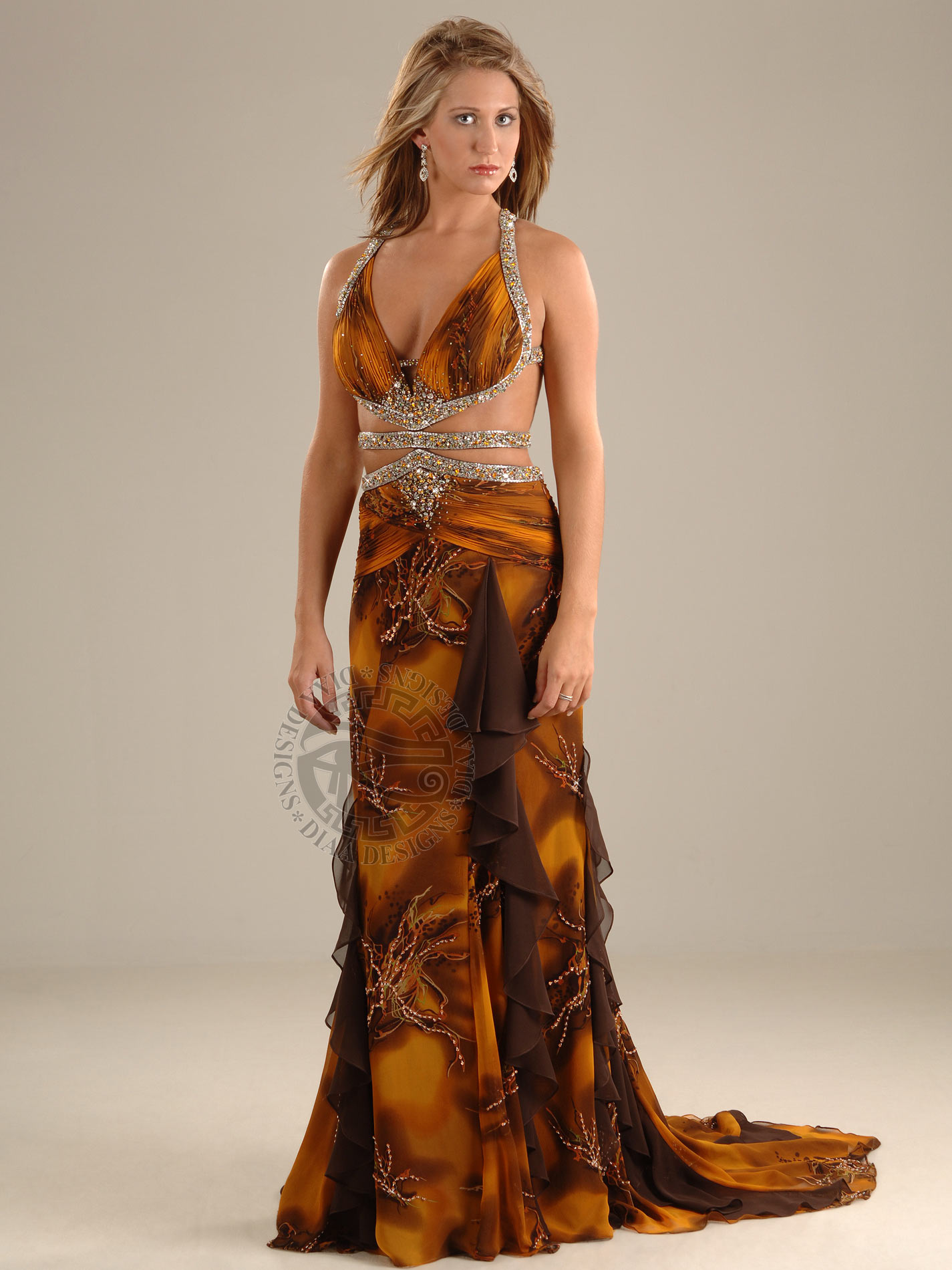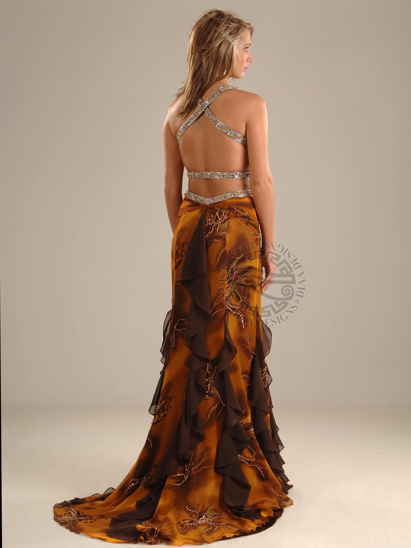 Stunning and sexy Print dress with plunged neckline and open waist with belt. This dress has inserted solid brown Chiffon seam ruffles with see-through illusioned front slit and scattered beads and sequins throughout dress. The straps and belt are fully beaded with scattered rhinestones. It also has an open sexy back with beaded criss-cross straps, a side zipper and a train.