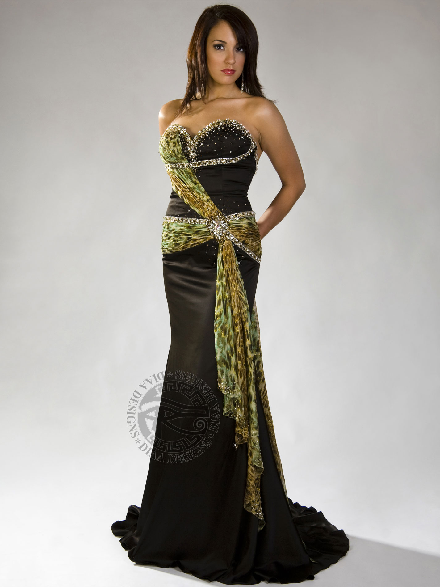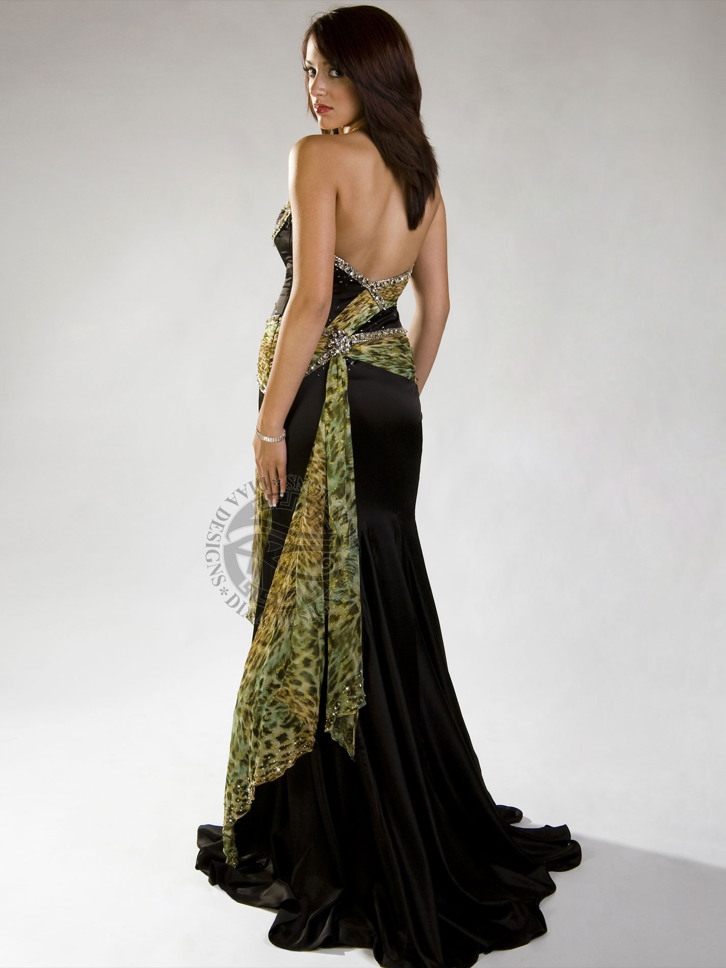 Elegant Satin sweetheart strapless dress with shimmery pleated Animal Print embellished upper front and back. This dress has hanging hankerchiefs of animal print flowing on front and back dress with rhinestone broach. It also has a side zipper, a long flowy train, and optional beaded straps.