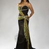Glamorous sweetheart strapless fitted dress with partially pleated print embellished on upper front and back leading to hanging handkerchief.