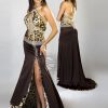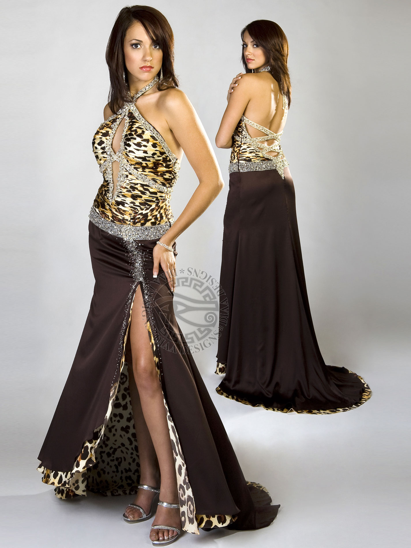 Hot and sexy embellished criss-cross halter low see-through plunged neckline with pleated Leopard Print upper front and back bodice. This dress has a low sexy open back with solidly beaded and rhinestoned criss-cross straps. It also has a front side slit with a Leopard under layer and a beaded and rhinestoned hip area shaped like a belt, a side zipper and a train.