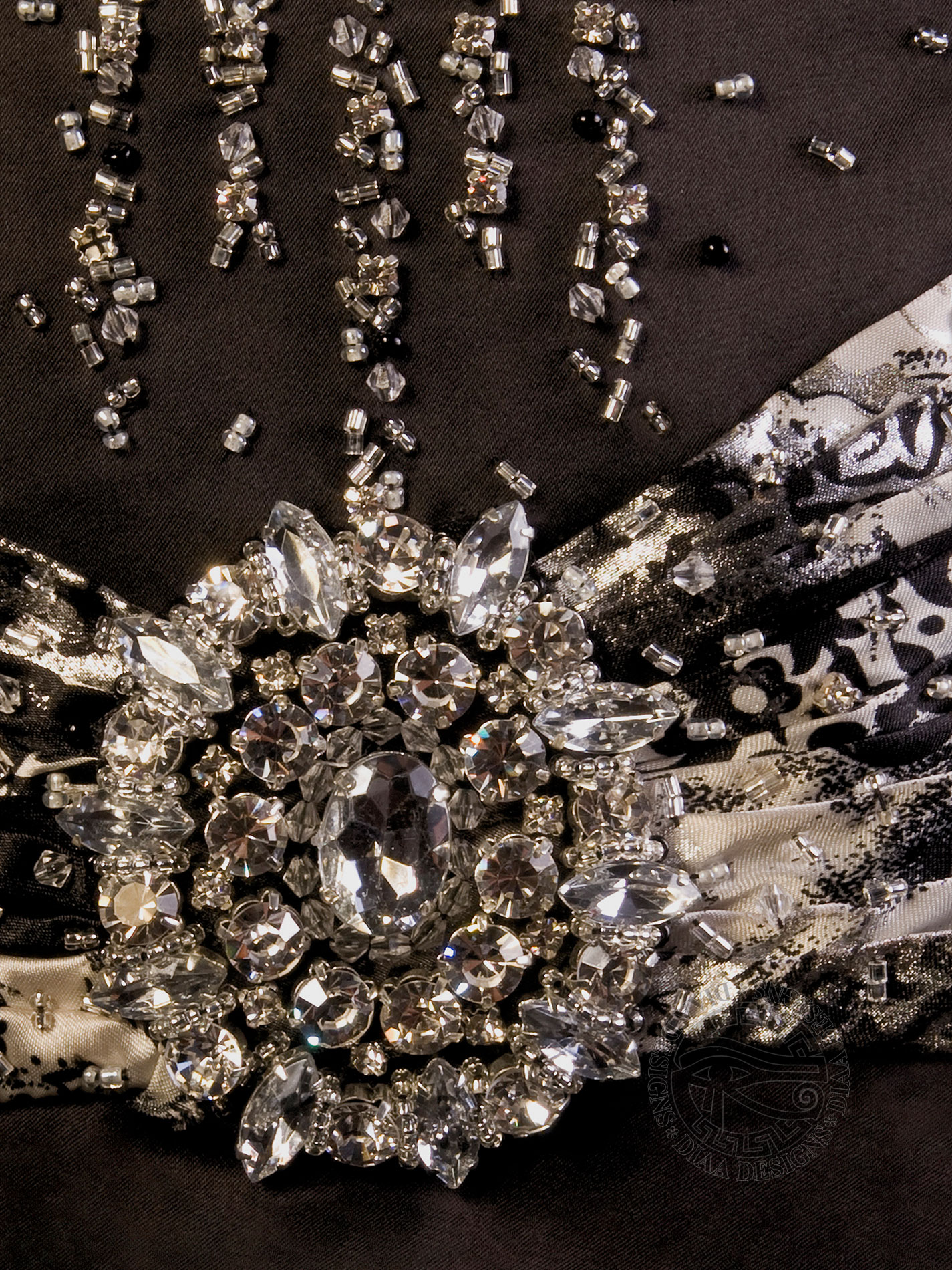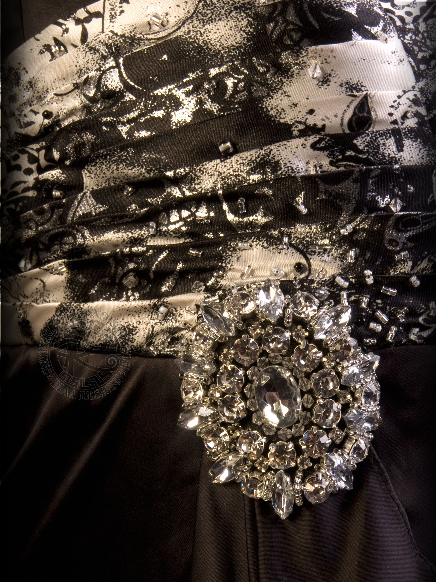 Beautiful Satin beaded and rhinestoned halter sweetheart straps dress with scattered beads and rhinestones on top front and back of dress. This dress has a diamond shape open back, pleated print around lower waistline with rhinestone broach center and side of front dress as well on center back with a center back zipper. It also has a center front slit that has a print under skirt pleated all around leading to back train.