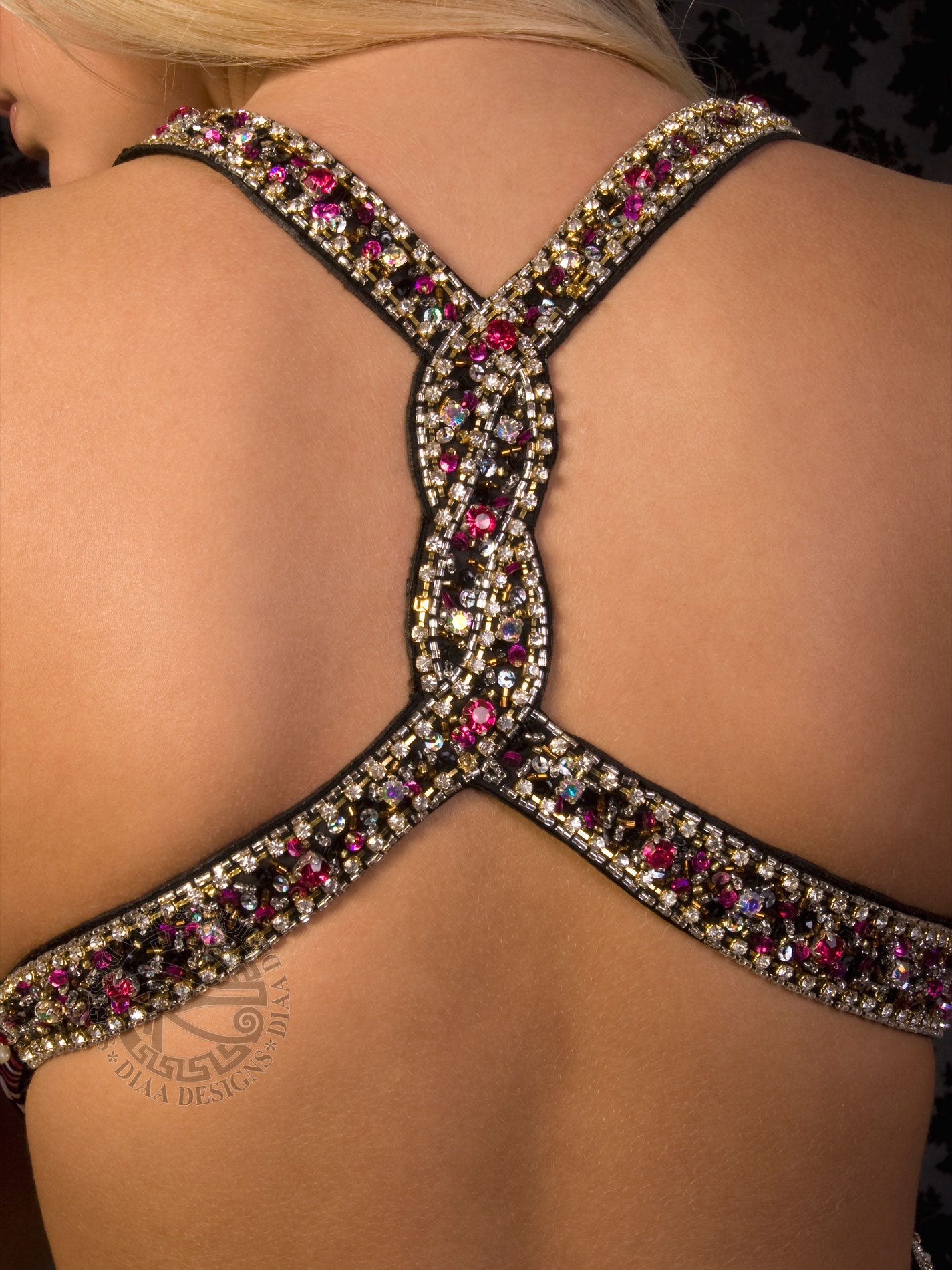 Absolutely stunning halter fitted dress that has X shaped front pleats and a high slit with Print lining. This dress is cut of a combination of Solid and Print Satin. The back is elegantly cut with a braided strap look and beaded with rhinestones. It also has a low, sexy back with side zipper that leads to a long train, as well with a Satin Print pleated overlay over train. Very elegant and sexy!