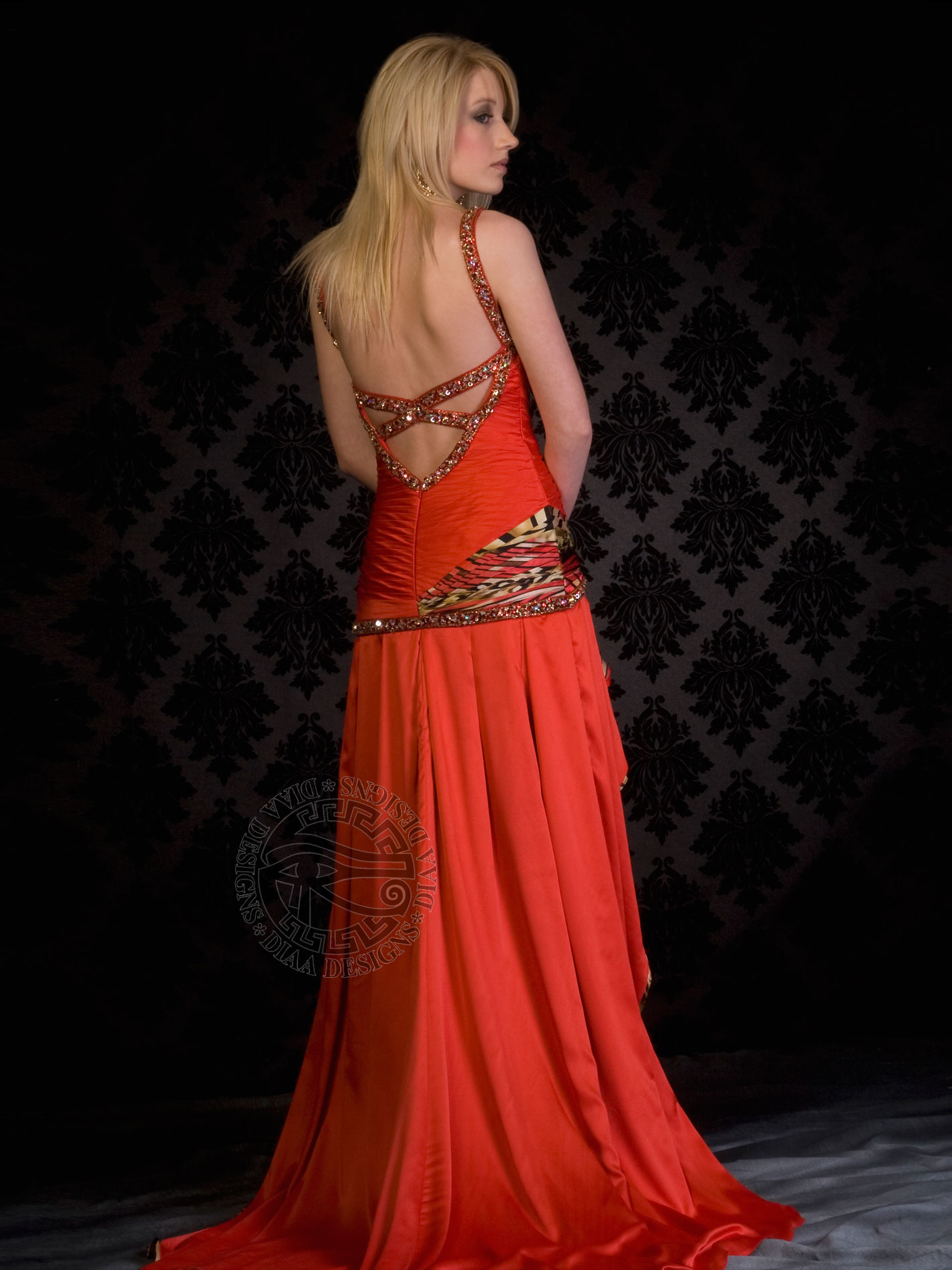 This Satin hi-lo dress has pleated combination of Solid and Printed Satin of upper front and back dress. It also has ruffled front drape and low back with back criss-cross straps and nice flowy back skirt that is lined with Animal print Satin leading to long train.