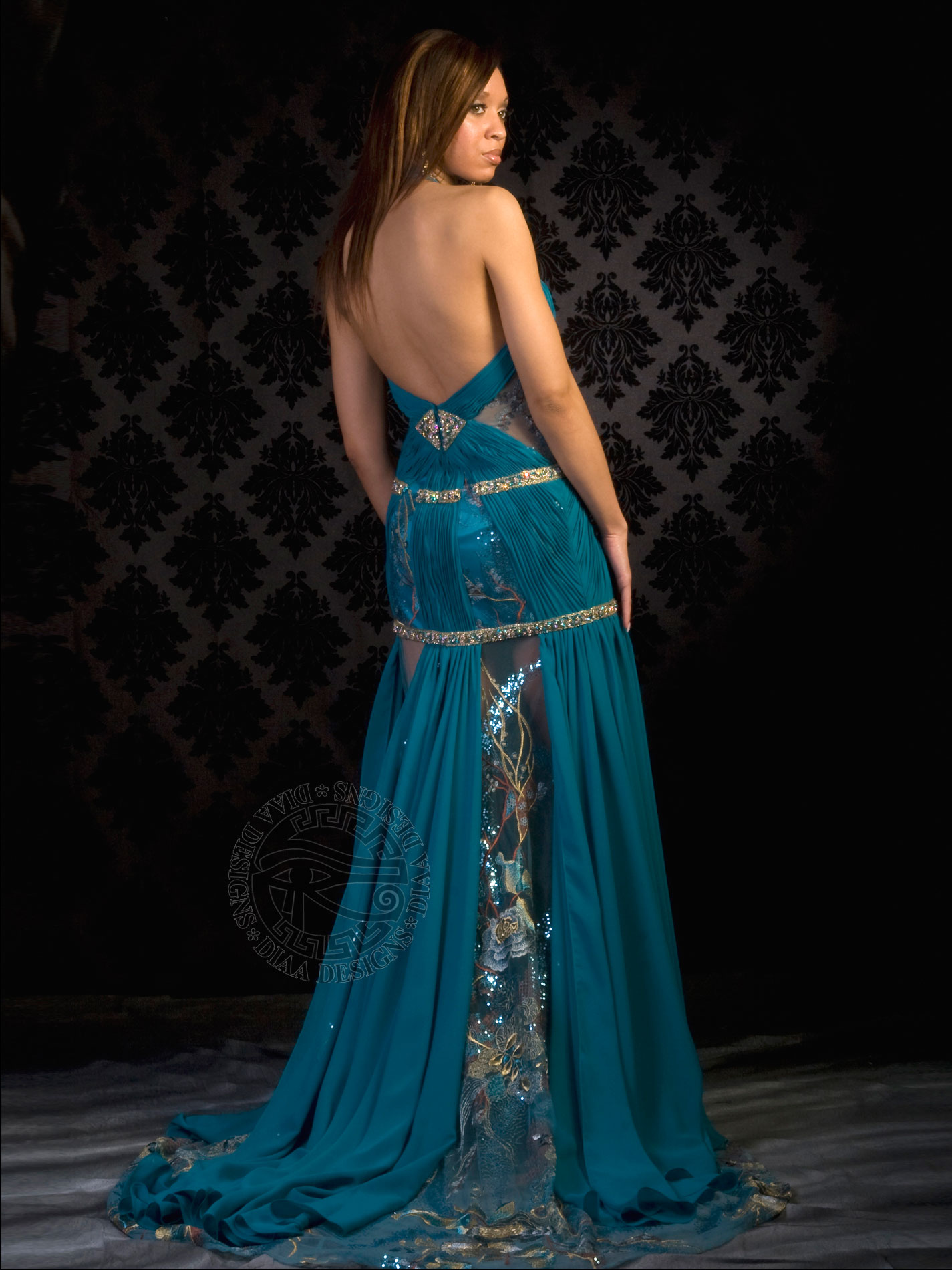 Attract everyone in this breathtaking pleated key-hole halter criss-cross neckline an V-shaped back. This glamorous fitted dress has X-shaped couture front and back pleating that meet at hip level and extend lower to floor in many over-lay softly flowing layers over see-through embellished Net embroidery that lead to long train. Also this dress has see-through waist sides and a center back zipper. Unique, Halter, Keyhole-Halter, Illusion, Sheer, Pleats, Layers, Open-back, Flowy