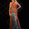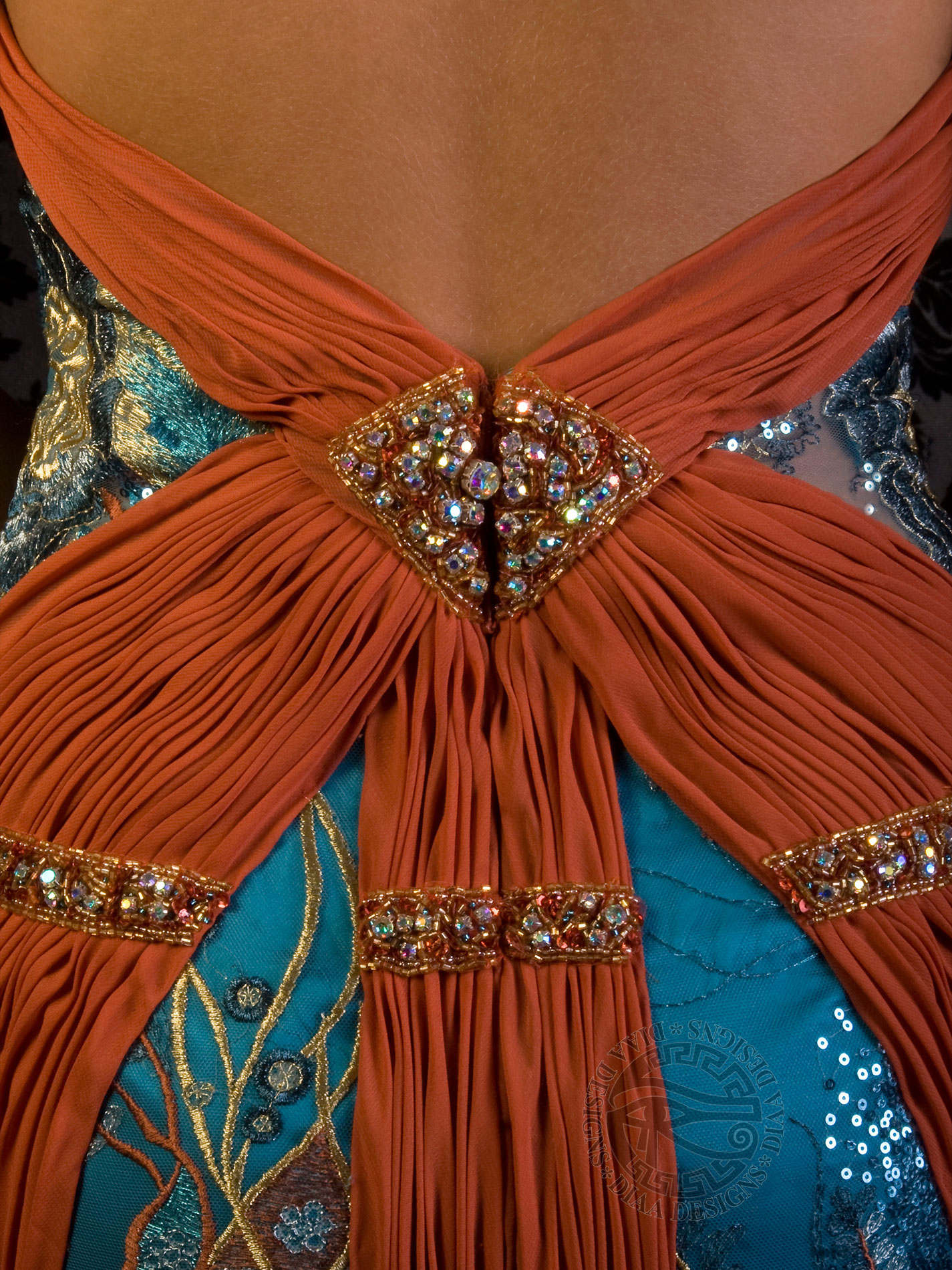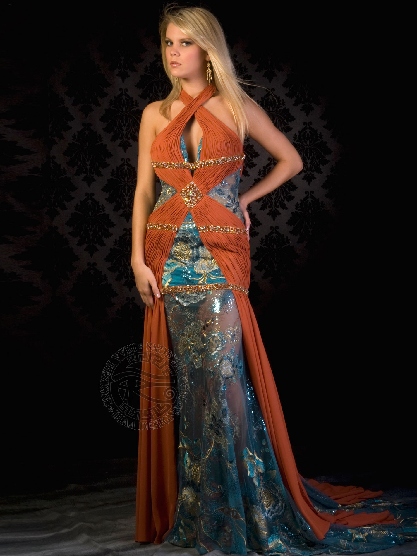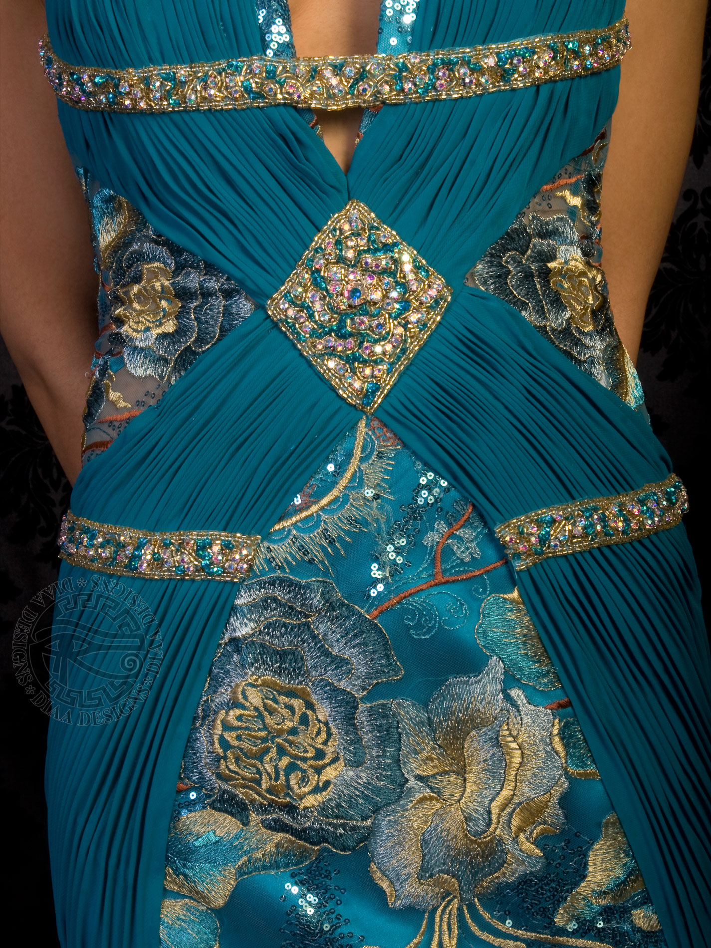 Attract everyone in this breathtaking pleated key-hole halter criss-cross neckline an V-shaped back. This glamorous fitted dress has X-shaped couture front and back pleating that meet at hip level and extend lower to floor in many over-lay softly flowing layers over see-through embellished Net embroidery that lead to long train. Also this dress has see-through waist sides and a center back zipper.