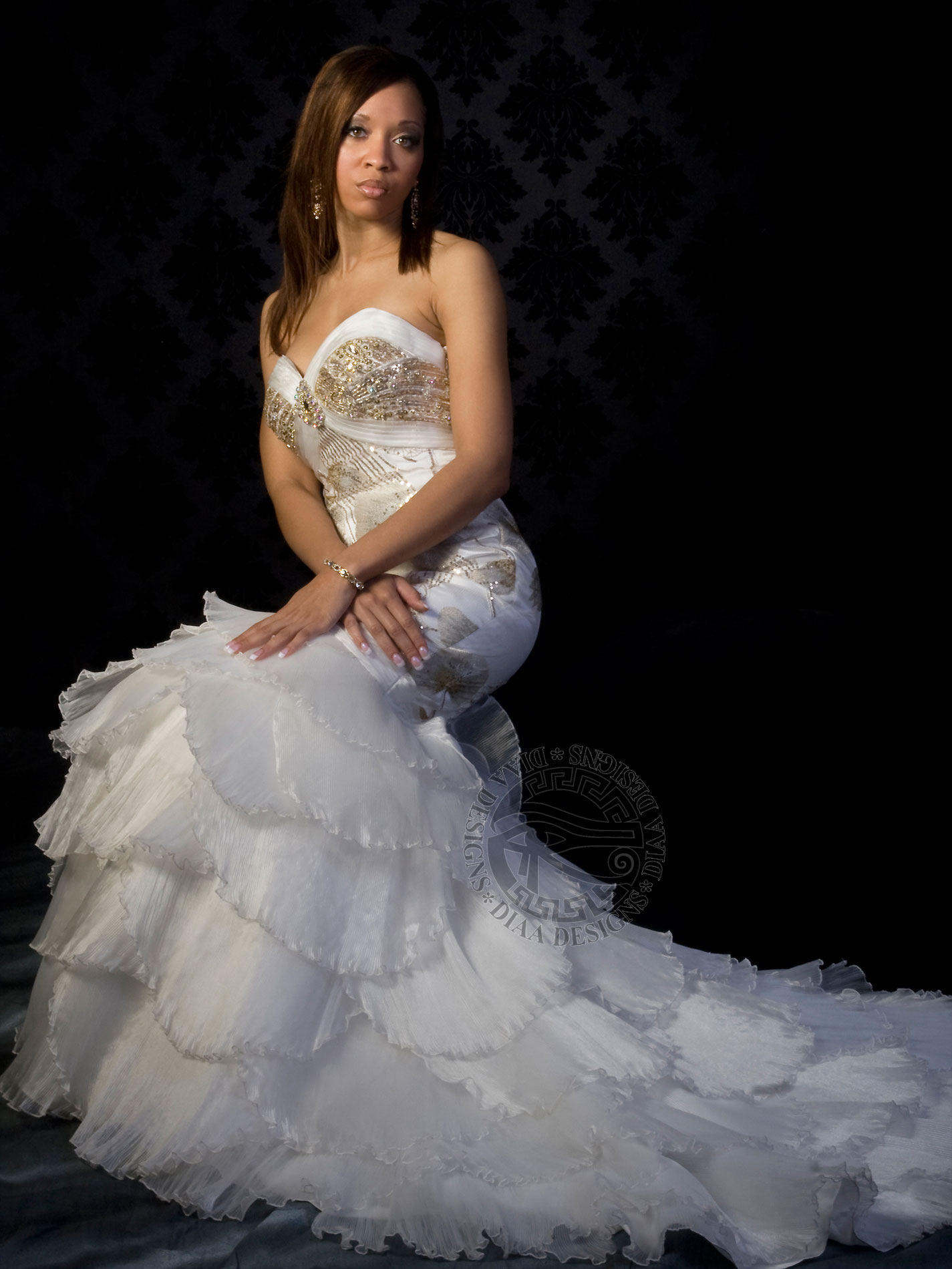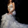 Stunning Hollywood Glamour dress with a strapless sweetheart neckline that has X shaped pleating and heavy beading with rhinestones over bust area. It also has V shaped back, center back zipper and mermaid cut lower dress with scalloped pleated layers that lead to long train. Elegantly embellished with rhinestones and beads.