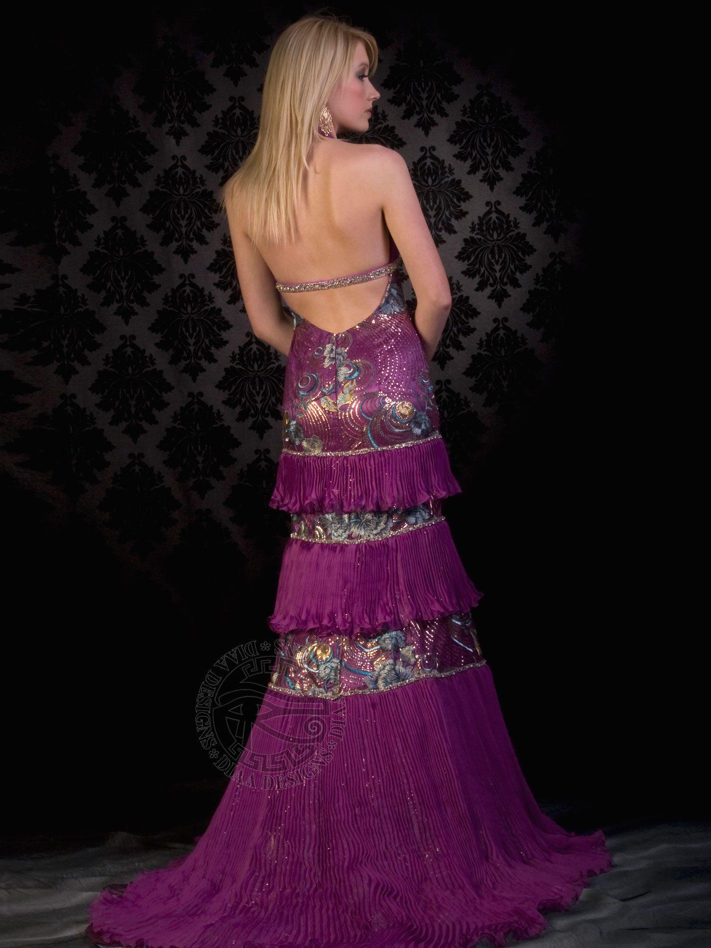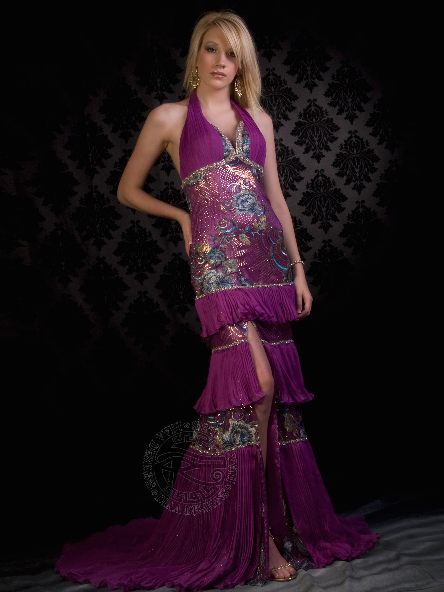 Exquisitely beautiful halter mermaid dress cut from a combination of embellished Net embroidery and Chiffon. Has pleated ruffled Chiffon layers with a side front slit and sexy low back with beaded strap across back leading down to pleated Chiffon layers over Net embroidery down to the train and a center back zipper. Halter, Layers, Mermaid, Low-Back