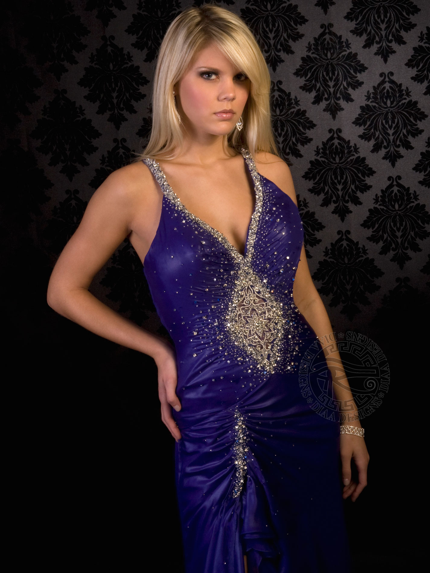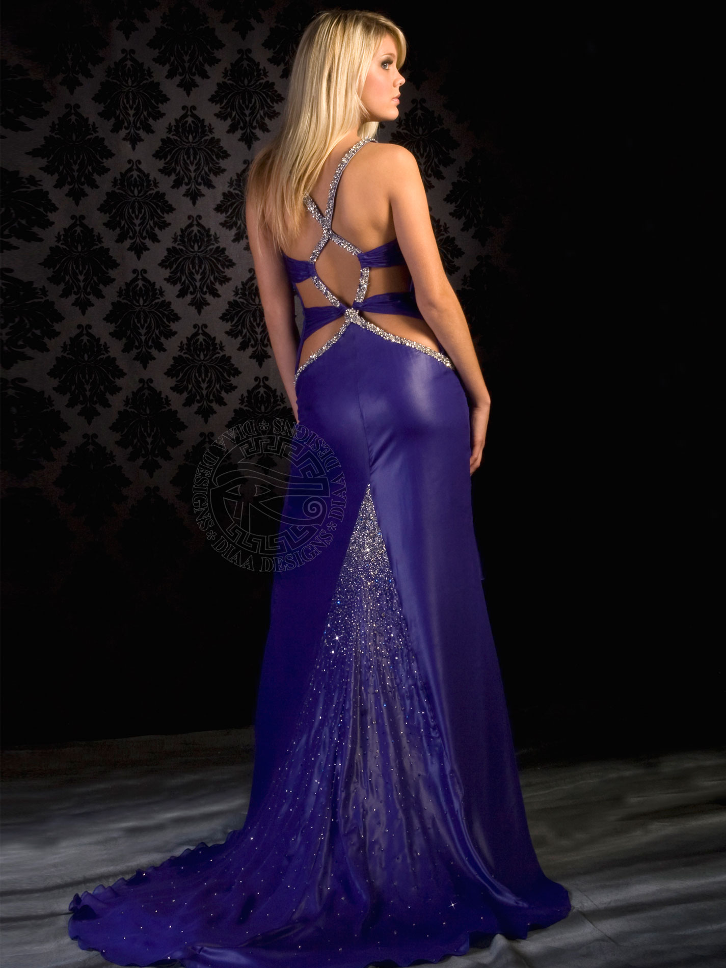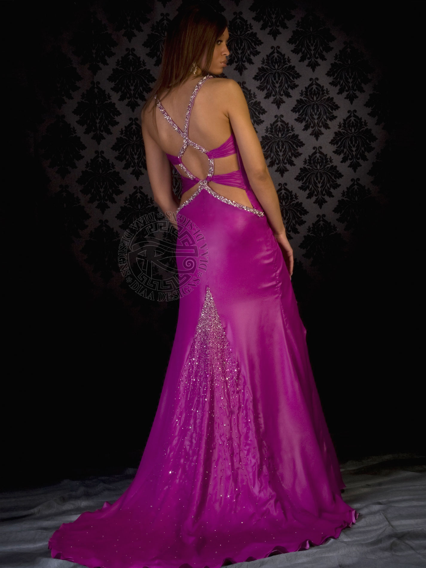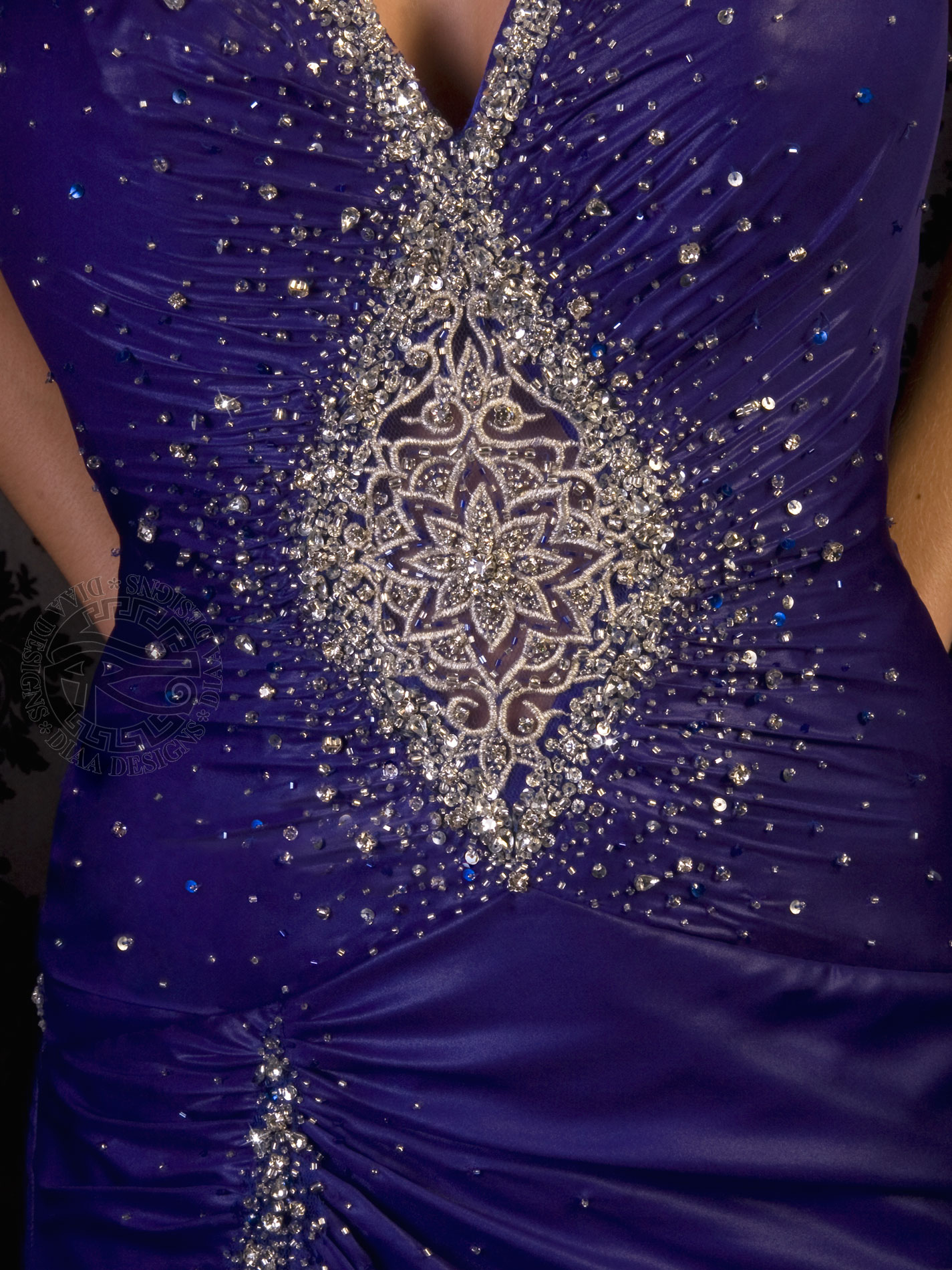 Stun everyone at your Event in this daringly sexy Shimmer Chiffon dress with V-shaped straps, a high front slit and intricate bodice center embroidery design with rhinestones and beads. Also has a low sexy open back with beads and rhinestones straps along with scattered beads heavy to light leading from center low part of back dress leading to train and side zipper.